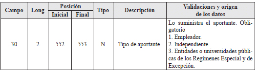 1. En el numeral 1.1 “Estructura de datos archivo tipo 1” del Capítulo 1 “Archivos de entrada” del Anexo Técnico 2 “Aportes a Seguridad Social de Activos” modificar las validaciones y origen de los datos del campo “30 - Tipo de pagador”; incluyendo “Pagador prestación humanitaria” así: