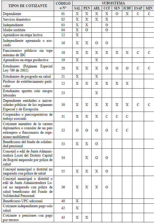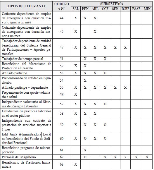 6. Cotizante perteneciente a un régimen exceptuado de pensiones o a entidades autorizadas para recibir aportes exclusivamente de un grupo de sus propios trabajadores: Solo puede ser utilizado cuando el cotizante se encuentra vinculado como cotizante activo en pensiones a un régimen exceptuado o a una entidad autorizada para recibir aportes exclusivamente de un grupo de sus propios trabajadores, como es el caso del magisterio, las fuerzas militares, Ecopetrol y Frontino Gold Mines.