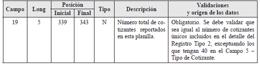 3. En el numeral 2.1.1.1 “Estructura Registro Tipo 1 del Archivo Tipo 2. Encabezado” del Capítulo 1 “Archivos de entrada” del Anexo Técnico 2 “Aportes a Seguridad Social de Activos” modificar la descripción del campo “19 - Número total de empleados por “Número total de cotizantes reportados en esta planilla”, así: