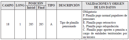 1. En el numeral 2.1.1 “Estructura registro tipo 1 del archivo tipo 2. Encabezado” del Capítulo 1 del Anexo Técnico 3 “Aportes a seguridad social de pensionados” modificar las validaciones y origen de los datos del campo “18 - Tipo de planilla pensionado”, así: