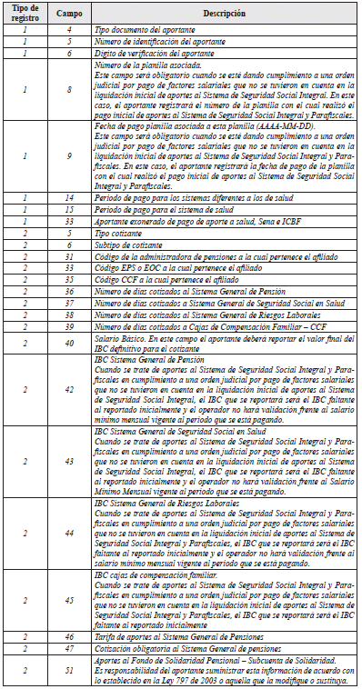 c) Cuando se trate del pago de aportes al Sistema de Seguridad Social Integral y Parafiscales que esté dando cumplimiento a una orden judicial por pago de factores salariales que no se tuvieron en cuenta en la liquidación inicial de aportes al Sistema de Seguridad Social Integral y Parafiscales, el Ingreso Base de Cotización reportado en los campos 42 – “IBC Sistema General de Pensión”, 43 – “IBC Sistema General de Seguridad Social en Salud”, 44 –“IBC Sistema General de Riesgos Laborales” podrá ser inferior al Salario Mínimo Legal Mensual Vigente.