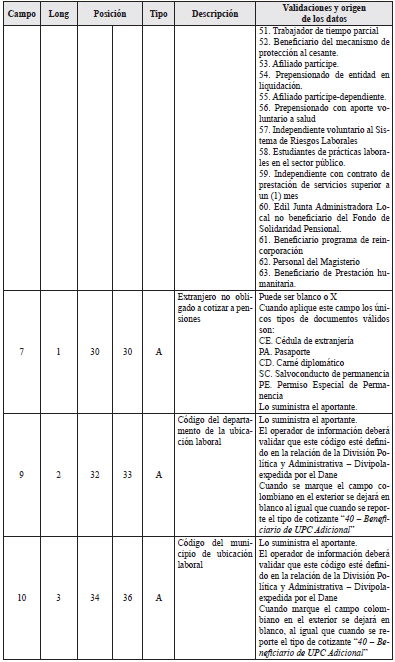 5. En el numeral 2.1.2.1 “Descripción detallada de las variables de novedades generales. Registro tipo 2” del Capítulo 1 “Archivos de entrada” del Anexo Técnico 2 “Aportes a Seguridad Social de Activos” modificar las validaciones y origen de los datos de los campos “5- Tipo de cotizante”, “7- Extranjero no obligado a cotizar a pensiones”, “9 - Código del departamento de la ubicación laboral” y “10 - Código del municipio de ubicación laboral”; así: