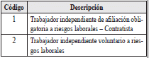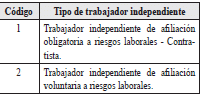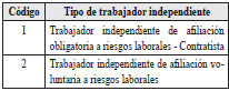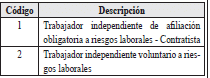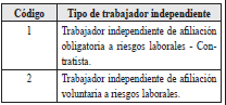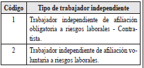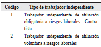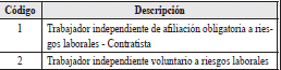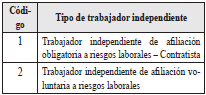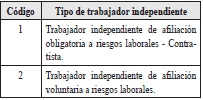 | 2 | Tipo de documento del trabajador independiente afiliado a riesgos laborales | 2 | A | Los valores permitidos son![]() | SI |