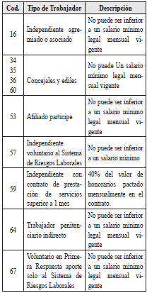 | 16 | Código de la actividad económica del trabajador independiente | 7 | N | Corresponde al código de la actividad económica del trabajador independiente de afiliación obligatoria a riesgos laborales. Valores permitidos: Los códigos establecidos en el Decreto número 768 de 2022. |