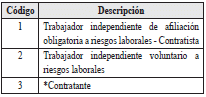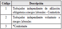 | 1 | Tipo de trabajador independiente al que se aplica la novedad | 1 | A | Los valores permitidos son![]() *Aplica cuando el contratante debe pagara el valor de la cotizacion, cuando la afiliacion del contratista sea por riesgo IV o V | SI |