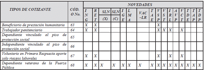 | 67 | Voluntario en primera respuesta aporte solo al Sistema de Riesgos Laborales |