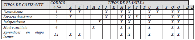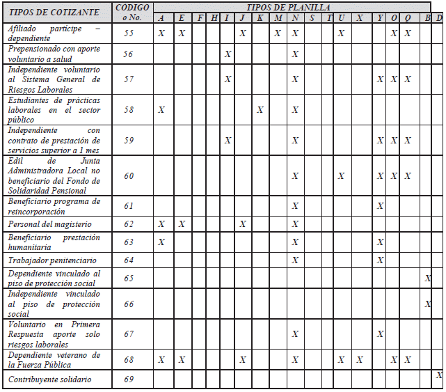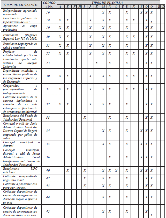 "X - Planilla para el pago de empresas en proceso de liquidación, reestructuración o en procesos concursales: Es utilizada por empresas que se encuentran en proceso de liquidación, reestructuración o en procesos concursales y requieren girar aportes al Sistema de Seguridad Social Integral y Parafiscales, los cuales no alcanzan a cubrir la totalidad de la tarifa obligatoria.