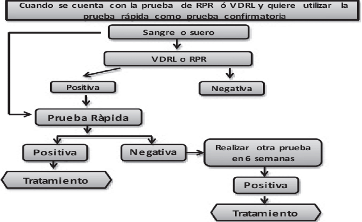 Las pruebas rápidas para la detección de sífilis corresponden a pruebas treponémicas. Por tal motivo, estas pruebas pueden ser usadas dentro de la estrategia de diagnóstico de sífilis, acorde con los algoritmos establecidos y según las características de la Institución Prestadora de Servicios de Salud (IPS). Así las cosas, cuando una IPS cuente en laboratorio clínico con pruebas no treponémicas (VDRL, RPR) y no disponga de las pruebas treponémicas convencionales, para confirmar el diagnóstico, podrá utilizar como alternativa las pruebas rápidas.