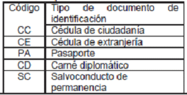 | CC | Cédula de ciudadanía, es el documento expedido por la Registraduría Nacional del Estado Civil con el que se identifican las personas al cumplir 18 años de edad. |