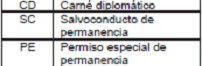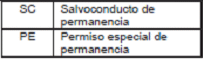 | SC | Salvoconducto de permanencia, es un documento de carácter temporal expedido por la Unidad Administrativa Especial de Migración Colombia a los extranjeros gue deban permanecer en el país mientras resuelven su situación de refugiados o asilados. Tiene una validez de tres meses y debe ser renovado o sustituido por la cédula de extranjería. |