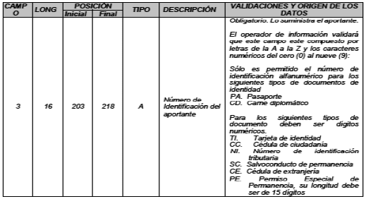 1. En el numeral 1.1 “Estructura de datos archivo tipo 1” del Capítulo 1 “Archivos de entrada” del Anexo Técnico 2 “Aportes a Seguridad Social de Activos” modificar las validaciones y origen de los datos del campo “3 - Número de Identificación del aportante”; así: