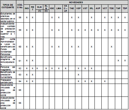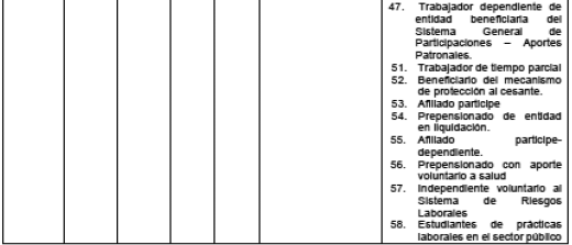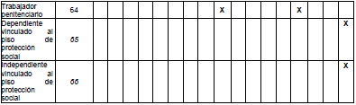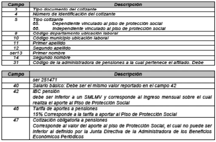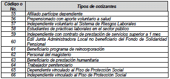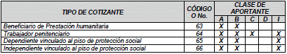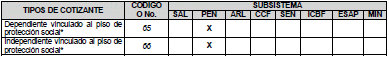 65- Dependiente vinculado piso de protección social: Este tipo de cotizante es utilizado por empleadores para el pago del aporte al Piso de Protección Social de las personas vinculadas laboralmente por tiempo parcial y que en virtud de ello reciban un ingreso total mensual inferior a un (1) Salario Mínimo Legal Mensual Vigente.