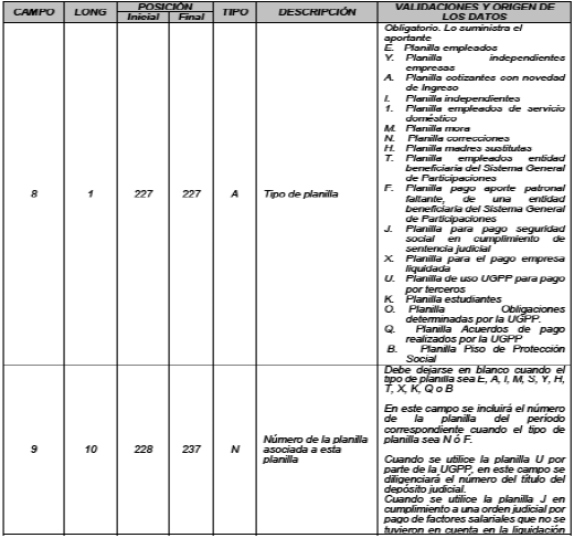 O. Planilla Obligaciones determinadas por la UGPP: Solamente puede ser utilizada por aportantes que vayan a realizar el pago de aportes a los Sistemas Generales de Seguridad Social en Salud, Pensiones, Riesgos Laborales y parafiscales determinados por la UGPP como omisos, inexactos y morosos y se encuentren reportados con los indicadores UGPP 1, 2, 3, 4, 5, 6, 7 o 9. La UGPP enviará a este Ministerio a través de la Plataforma de Intercambio de Información (PISIS) del Sistema Integral de Información de la Protección Social (SISPRO), la información que se relaciona a continuación con la estructura que se encuentra publicada en el portal de SISPRO, en la sección de anexos técnicos (PUB205RTRI), con periodicidad mensual o cuando se requiera. Esta información será dispuesta en un FTP seguro a los operadores de información, con el objetivo de que el operador valide la información y verifique si el aportante puede hacer uso de esta planilla: