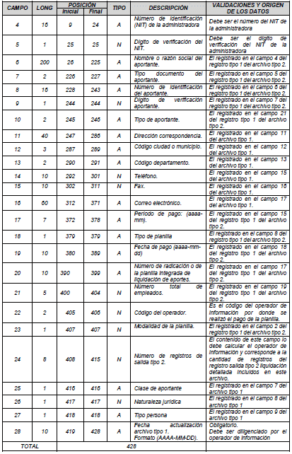 3. En el numeral 2.1.1.1 “Estructura registro tipo 1 del archivo tipo 2. Encabezado” del Capítulo 1 “Archivos de entrada” del Anexo Técnico 2 “Aportes a Seguridad Social de Activos” modificar las validaciones y origen de los datos de los campos “8 – Tipo de planilla”, “9 – Número de la planilla asociada a esta planilla”, “10 - Fecha de pago Planilla asociada a esta planilla” y “20 - Valor total de la nómina”; así: