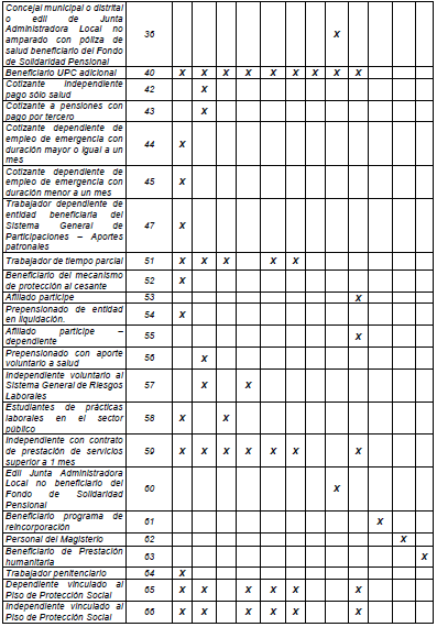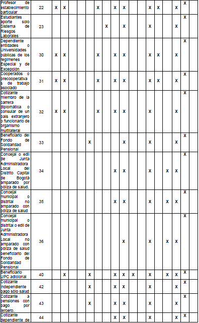 “16 - Por convenio internacional: Es concedida en virtud de convenios internacionales suscritos por el Gobierno, debe aportar al Sistema General de Seguridad Social en Salud de acuerdo con la tarifa vigente para pensionados. El valor del Ingreso Base de Cotización puede ser inferior a un 1 SMMLV y el tope máximo hasta 25 veces el smmlv.