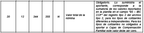Este campo es obligatorio para mesadas superiores a 10 smlmv. Cuando el valor reportado en el campo “63 - Valor total de la mesada pensional” del registro tipo 2 del archivo tipo 2, sea superior a 10 smlmv, el operador de información deberá multiplicar el valor del campo “58 - Valor de mesada pensional” del registro tipo 2, por el factor correspondiente al valor total de la mesada pensional y liquidar el aporte a la Subcuenta de Subsistencia de dicho Fondo. En este caso, el aporte se debe efectuar a la Subcuenta de Solidaridad del Fondo de Solidaridad Pensional, mediante el código FSP001 - Fondo de Solidaridad Pensional. El valor incluido en este campo debe cumplir las reglas de redondeo o aproximación para las cotizaciones, de acuerdo con las normas vigentes.