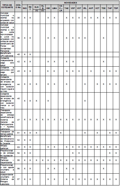 | C | Este valor solo puede ser utilizado cuando el tipo de cotizante sea “3- Independiente”, “4- Madre Sustituta”, “16 - Independiente agremiado o asociado”, “34 - Concejal o edil de Junta Administradora Local del Distrito Capital de Bogotá amparado por póliza de salud”, “35- Concejal municipal o distrital no amparado con póliza de salud”, “53- Afiliado participe”, “57- Independiente voluntario al Sistema de Riesgos Laborales” o “59 Independiente con contrato de prestación de servicios superior a un mes”. Cuando se usa este valor, se indica que el cotizante se retira únicamente del Sistema de Subsidio Familiar y solo en el archivo de salida para ese Sistema se marca esta novedad de retiro con una C. En los archivos de salida del resto de sistemas se deja en blanco esta novedad. |