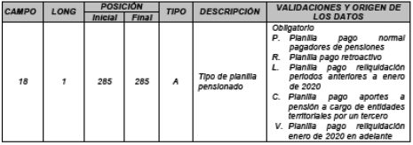 3. En el numeral 2.1.2.2 “Campo 18 - Tipo de planilla pensionado” del Capítulo 1 “Archivos de entrada” del Anexo Técnico 3 “Aportes a Seguridad Social de Pensionados” modificar la aclaración para el tipo de planilla “L - Planilla pago reliquidación” y se adiciona la aclaración para el tipo de Planilla “V - Planilla pago reliquidación enero de 2020 en adelante”, así: