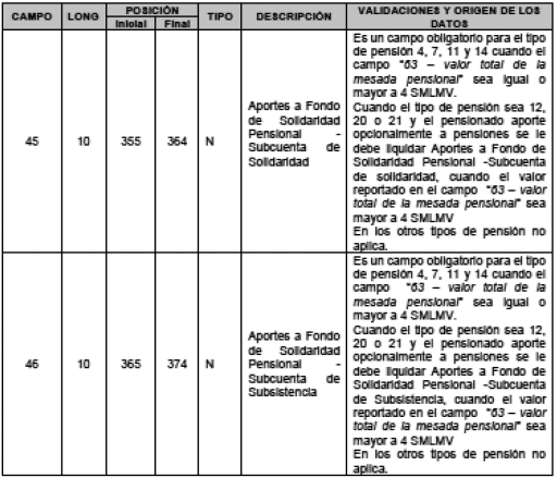 4. En el numeral 2.2.1 “Descripción detallada de las variables de novedades generales. Registro tipo 2” del Capítulo 1 “Archivos de entrada” del Anexo Técnico 3 “Aportes a Seguridad Social de Pensionados” modificar las validaciones y origen de los datos de los campos “45 - Aportes a Fondo de solidaridad pensional -Subcuenta de solidaridad”, “46 - Aportes a Fondo de Solidaridad Pensional -Subcuenta de Subsistencia” y “63 - Valor total de la mesada pensional”; así: