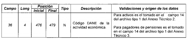5.2 La adición del campo “36 -Código DANE de la actividad económica” establecida en el numeral 3.2.1 “Estructura de datos del registro de salida tipo 1. Encabezado planilla” deberá ser implementadas por todos los actores del Sistema de Seguridad Social Integral y parafiscales para los pagos que se realicen a partir del 1 de febrero de 2021”.