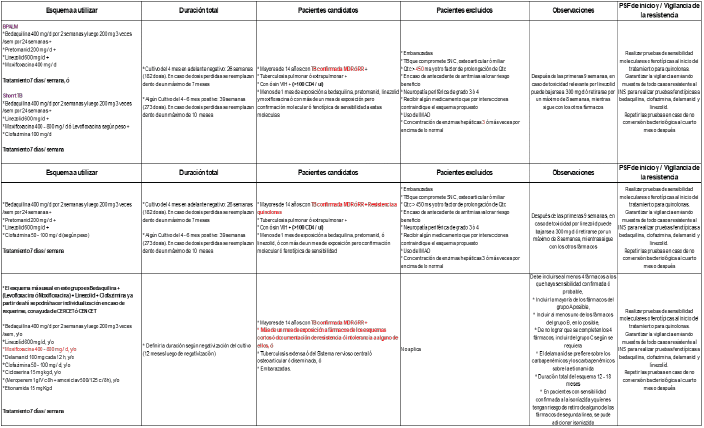 De igual forma, se deberán implementar los ESQUEMAS CORTOS DISPONIBLES EN EL PAÍS (Anexo). La base científica de esta medida está soportada en la disponibilidad de fármacos como la bedaquilina, clofazimine y el linezolid, que sumados a las quinolonas suministran el suficiente efecto bactericida y esterilizante, permitiendo en primera instancia continuar con esquemas totalmente orales y en segunda acortar tratamientos. Estos medicamentos de uso específico para tuberculosis están incluidos en el Anexo 4. Medicamentos para Programas Especiales en Salud Pública, el linezolid y las quinolonas como levofloxacina y moxifloxacina incluidas en el anexo 1 “Listado de medicamentos financiados con recursos de la Unidad de Pago por Capitación (UPC)”.