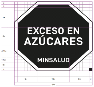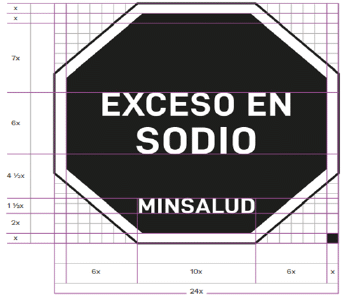 32.3. Forma del sello frontal de advertencia: La forma de destacar las características nutricionales indicadas en el inciso primero de este artículo será incluyendo sellos en la etiqueta, los cuales consistirán en un símbolo octagonal de fondo color negro y borde blanco, y en su interior el texto “Exceso En”, seguido de. “Grasas Saturadas” o “Grasas Trans” o “Sodio” o “Azúcares” o con el texto “Contiene Edulcorantes” de manera individual o con 2 o 3 o 4 o 5 sellos (según corresponda). Las letras del texto de los sellos deberán ser mayúsculas y de color blanco, tipo de letra Arial Bold. Además, en el mismo símbolo, deberá inscribirse en letras blancas, la palabra “MINSALUD”, según la figura 6 del presente artículo.