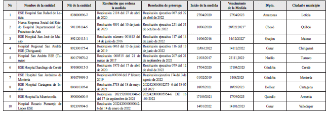 Que la Superintendencia Nacional de Salud remitió a este Ministerio el listado de las Empresas Sociales del Estado que se encuentran con medida de intervención forzosa administrativa para administrar, así: