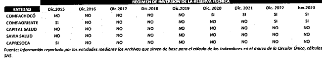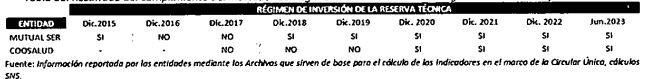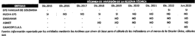 Que, la Superintendencia Nacional de Salud, dentro del marco de sus funciones, emite informes periódicos con la finalidad de verificar el cumplimiento de los requisitos financieros de habilitación y permanencia de las Entidades Promotoras de salud; de acuerdo a ello, la entidad de vigilancia para el sector salud profirió informe denominado “Evaluación del cumplimiento de los indicadores de capital mínimo, patrimonio adecuado y régimen de inversión de reserva técnica-junio 2023", el cual refleja el histórico de cumplimiento (incumplimiento) de la condición financiera de régimen de inversiones de reservas técnicas de la temporalidad de diciembre 2015 hasta junio 2023 de las promotoras de salud, arrojando los siguientes resultados;