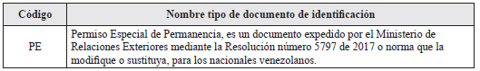 Tipo de documento de identificación: Registrar en el espacio el código que corresponde al documento con el cual se va a identificar, de acuerdo con las siguientes opciones: