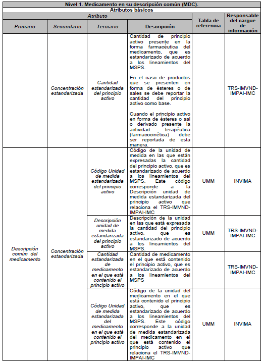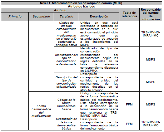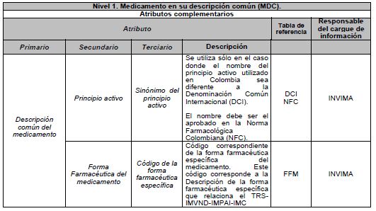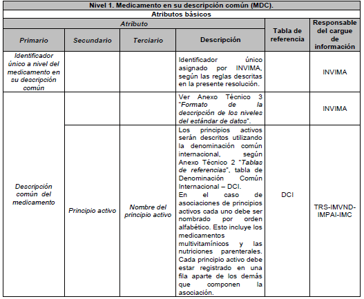 ARTÍCULO 6o. NIVEL 1. Medicamento en su descripción común (MDC). Es el medicamento en su Denominación Común Internacional (DCI), según las tablas de referencia adaptadas por el país y está compuesto por los siguientes atributos básicos: