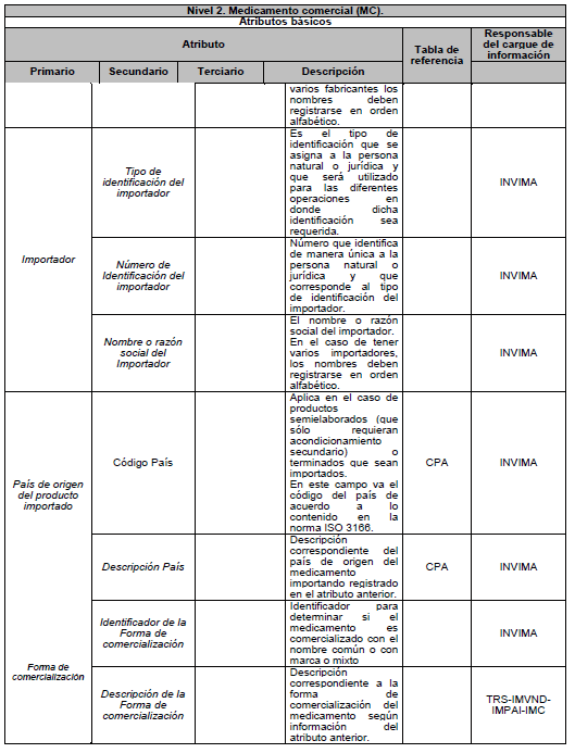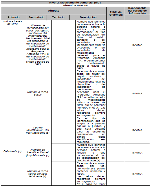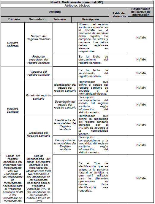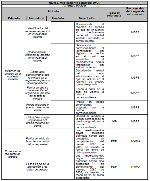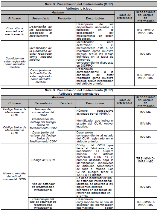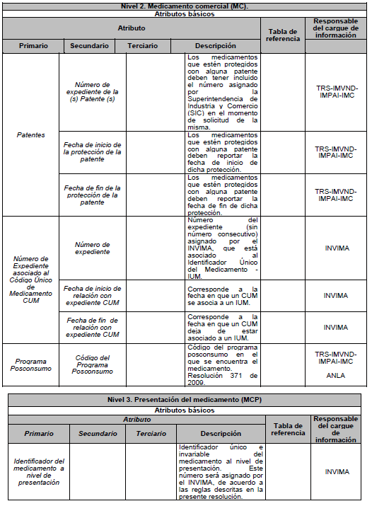 ARTÍCULO 9o. ATRIBUTOS DEL ESTÁNDAR DE DATOS DE MEDICAMENTOS DE USO HUMANO. Cada nivel de descripción del medicamento a que hace referencia el artículo 5o de la presente resolución, tiene dos tipos de atributos: