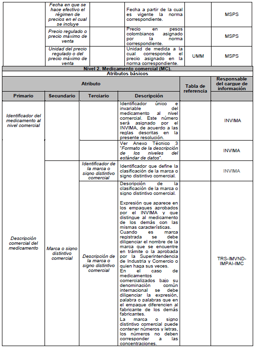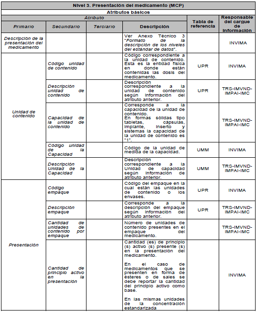ARTÍCULO 5o. NIVELES DE DESCRIPCIÓN DEL MEDICAMENTO. Para efectos del estándar de datos, el medicamento se describe en tres niveles: Nivel 1. Medicamento en su descripción común; Nivel 2. Medicamento comercial y Nivel 3. Medicamento con presentación comercial, de acuerdo con el Anexo Técnico 3 “Formato de la Descripción de los niveles del estándar de datos” el cual hace parte integral de la presente resolución.