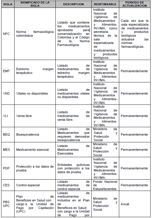 10.3. Tablas de referencia: Listados que deben ser utilizados para conocer el identificador y la descripción de aquellos atributos del estándar de datos de medicamentos que se encuentran definidos y son generados por autoridades y organizaciones nacionales e internacionales. La actualización de las Tablas de Referencia será realizada por el Invima, en coordinación con este Ministerio.