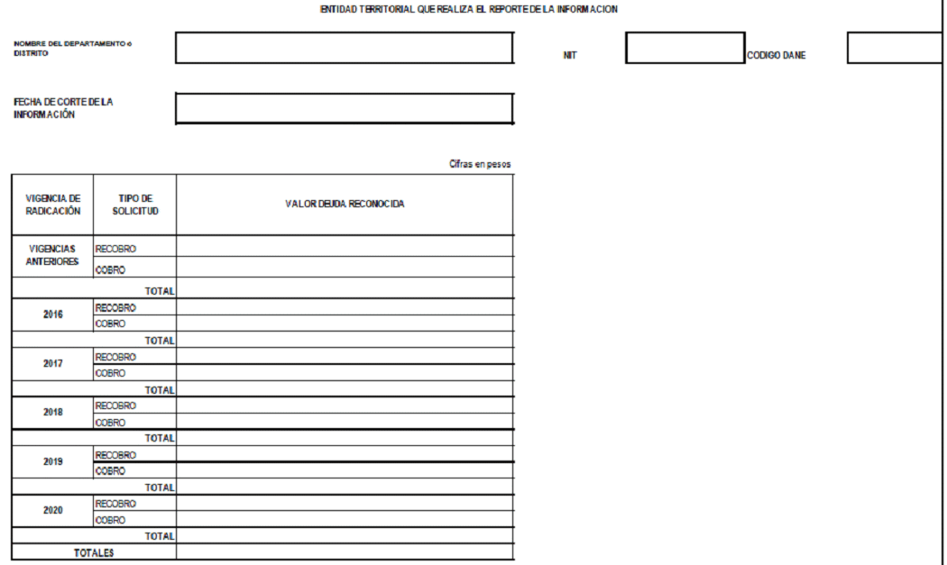 3.1.1. Certificación de deuda reconocida por parte de la entidad territorial. A través del formato contenido en el Anexo 1, el cual hace parte integral de la presente resolución, se certificará la deuda reconocida que deberá remitir la entidad territorial en cada una de las fases establecidas en el Plan de Saneamiento de las facturas cobradas y recobradas por concepto de servicios y tecnologías en salud no financiadas con cargo a la UPC del Régimen Subsidiado radicadas, auditadas, conciliadas y reconocidas en el marco del artículo 238 de la Ley 1955 de 2019.