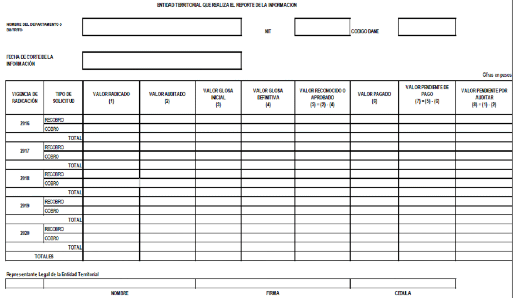 4.2 Reporte de información de facturas por concepto de cobros y recobros auditados y conciliados por parte de las entidades territoriales para cada fase. Con el formato contenido en el Anexo Técnico número 5, que hace parte integral de este acto administrativo, se efectuará el reporte de información de las cuentas auditadas y conciliadas objeto de saneamiento, en el marco de lo establecido en el artículo 238 de la Ley 1955 de 2019.