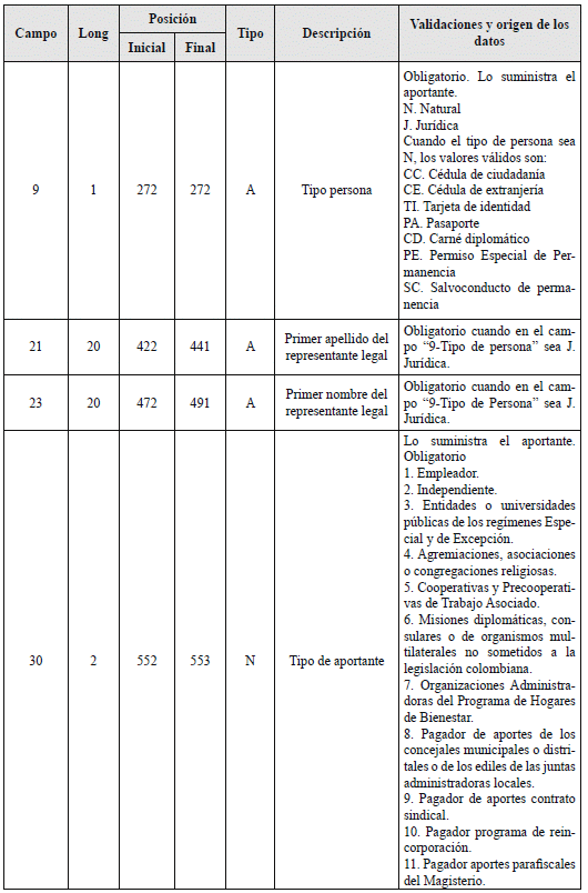 1. En el numeral 1.1 "Estructura de datos archivo tipo 1" del Capítulo 1 "Archivos de entrada" del Anexo Técnico 2 "Aportes a Seguridad Social de Activos" modificar la descripción y las validaciones y origen de los datos de los campos "9 - Tipo persona", "21- Primer apellido del representante legal", "23- Primer nombre del representante legal" y "30 - Tipo de aportante", así: