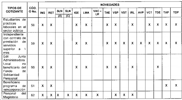 l) Este tipo de planilla solo puede ser utilizada para los tipos de cotizante "4 – Madre sustituta", "36 – Concejal municipal o distrital no amparado con póliza de salud beneficiario del Fondo de Solidaridad Pensional", "42 – Cotizante independiente pago solo salud", "52 – Beneficiario del mecanismo de protección al cesante" y "56 - Prepensionado con aporte voluntario a salud" para reportar novedades de retiro siempre y cuando la presentación de esta planilla se realice a más tardar el último día hábil del mes en que debe realizar el pago;