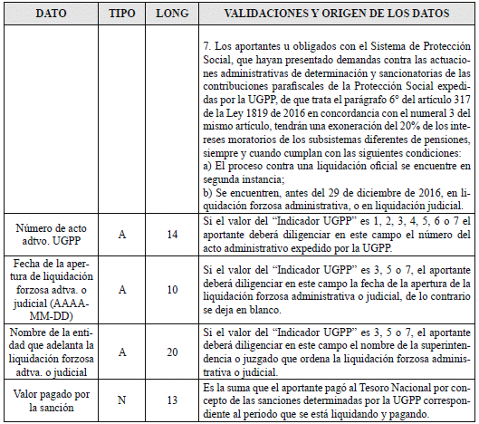 f. Si el aportante realiza el pago de aportes al Sistema General de Pensiones para periodos de pago de 2015 y anteriores, hasta el 30 de junio de 2017, se le aplicará una reducción del 70% de los intereses moratorios para los subsistemas diferentes al de pensiones, de acuerdo con lo establecido en el artículo 320 de la Ley 1819 de 2016, sin perjuicio de las acciones de fiscalización que en el marco de sus competencias adelante la UGPP. Esta liquidación de intereses de mora aplica para todos los tipos de planilla y no aplica para los cotizantes que no están obligados a aportar al Sistema General de Pensiones. Es responsabilidad del aportante suministrar esta información".