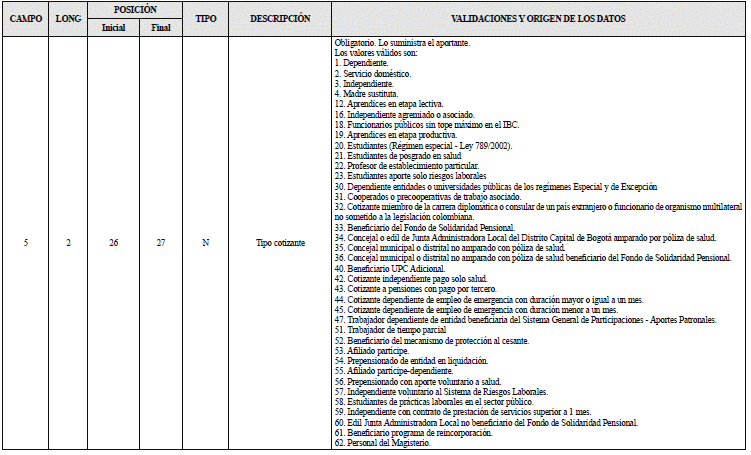 7. En el numeral 2.1.2.3.1 "Campo 5 - Tipo de Cotizante" del Capítulo 1 "Archivos de entrada" del Anexo Técnico 2 "Aportes a Seguridad Social de Activos" modificar las aclaraciones del tipo de cotizante "3 - Independiente", "4 - Madre Sustituta", "16 - Independiente agremiado o asociado", "23 - Estudiantes aporte solo riesgos laborales", "33 - Beneficiario del Fondo de Solidaridad Pensional", "34 - Concejal o edil de Junta Administradora Local del Distrito Capital de Bogotá amparado por póliza de salud", "35 - Concejal municipal o distrital no amparado con póliza de salud", "36 - Concejal municipal o distrital o edil de Junta Administradora Local no amparado con póliza de salud beneficiario del Fondo de Solidaridad Pensional", "42 - Cotizante independiente pago solo salud", "43 - Cotizante a pensiones con pago por tercero", "52 - Beneficiario del mecanismo de protección al cesante", "53 - Afiliado partícipe", "56 - Prepensionado con aporte voluntario en salud", "59 - Independiente con contrato de prestación de servicios superior a 1 mes" y "60 - Edil Junta Administradora Local no beneficiario del Fondo de Solidaridad Pensional"; y adicionar la aclaración del tipo de cotizante "62 - Personal del Magisterio", así: