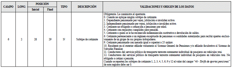 6. En el numeral 2.1.2.1 "Descripción detallada de las variables de novedades generales. Registro tipo 2" del Capítulo 1 "Archivos de entrada" del Anexo Técnico 2 "Aportes a Seguridad Social de Activos" modificar las validaciones y origen de los datos de los campos "5 - Tipo de Cotizante" y "6 - Subtipo de Cotizante" así: