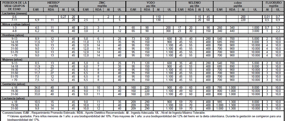 Tabla 23. Recomendaciones de ingesta de micro minerales para la población colombiana.