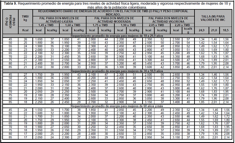 La siguiente tabla muestra la categoría de la actividad física y el rango de PAL correspondiente:
