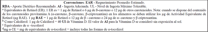 Convenciones: a EAR - Requerimiento Promedio Estimado b RDA - Aporte Dietético Recomendado c AMDR - Rango Aceptable de Distribución de Macronutrientes d AI - Ingesta Adecuada