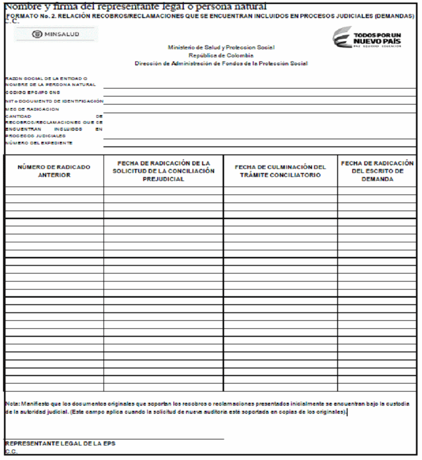 a) Formato número 2 que hace parte integral de la presente resolución, el que se utilizará para identificar la fecha de interrupción del término de caducidad de los recobros y reclamaciones que se encuentran incluidos en procesos judiciales.