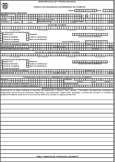El responsable del diligenciamiento del formato es el profesional tratante y se debe diligenciar cuando se toma la decisión de remitir un paciente a otro Prestador de servicios de salud. En caso de que las condiciones del paciente atendido en el servicio de urgencia varíen entre el momento del diligenciamiento del formato y el momento efectivo de traslado del paciente, deberá ser actualizado dicho formato.
