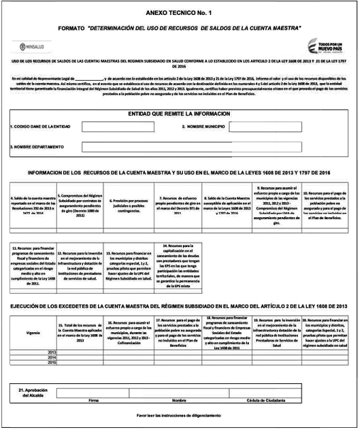 -- Los departamentos, en forma obligatoria, deberán diligenciar integralmente el formato y enviar a la Dirección de Financiamiento Sectorial del Ministerio de Salud y Protección Social a través del correo cuentasmaestras@minsalud.gov.co, dentro de los plazos establecidos, junto con una copia del Anexo número 1 “DETERMINACIÓN DEL USO DE RECURSOS DE SALDOS DE LA CUENTA MAESTRA”, remitido por los municipios.