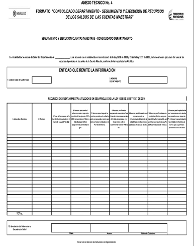 -- Los departamentos, en forma obligatoria, deberán diligenciar integralmente el formato y enviar a la Dirección de Financiamiento Sectorial del Ministerio de Salud y Protección Social a través del correo cuentasmaestras@minsalud.gov.co, dentro de los plazos establecidos, junto con una copia del Anexo número 4 “Seguimiento y Ejecución de los Recursos de saldos de la cuenta maestra”, remitido por los municipios.
