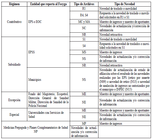 2. Estructura y especificaciones de los archivos maestros y de novedades y/o actualización que de acuerdo con el régimen deben remitir al administrador fiduciario de los recursos del Fondo de Solidaridad y Garantía - Fosyga las entidades obligadas a su reporte.