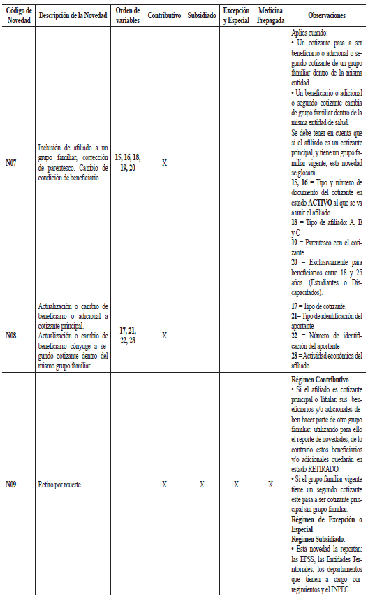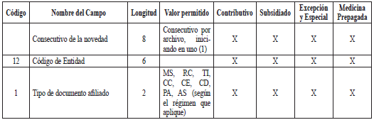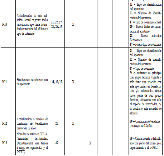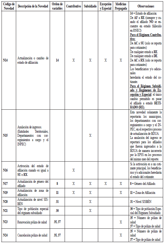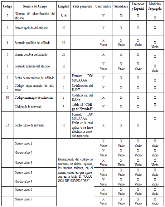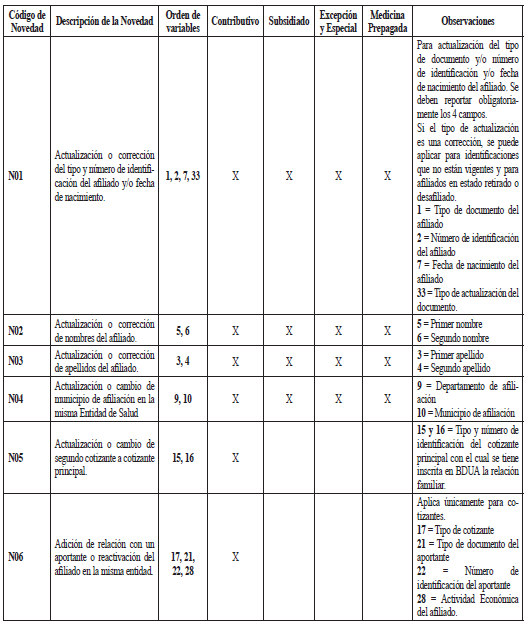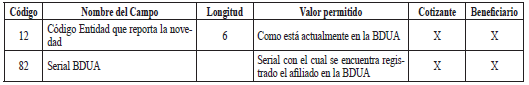 Se deben diligenciar todos los campos en el orden establecido por esta tabla, estas novedades aplican para afiliados registrados en la BDUA.