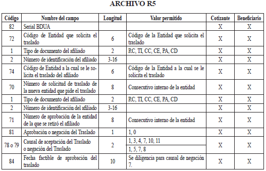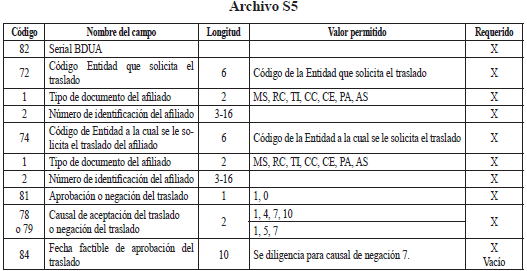 Archivos R5, S5: Son los archivos con los registros de resultado que entrega el administrador fiduciario de los recursos del Fondo de Solidaridad y Garantía – Fosyga, a la Entidad2. Estos archivos contienen registros con los traslados efectivamente actualizados en la BDUA y los registros de traslados que no fueron aceptados por parte de la Entidad1.
